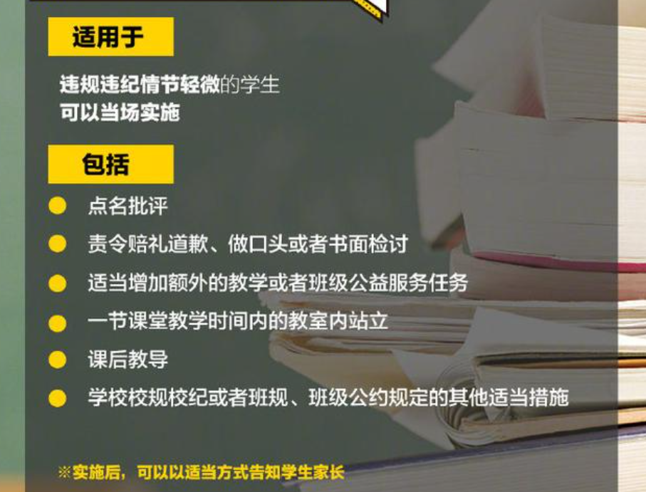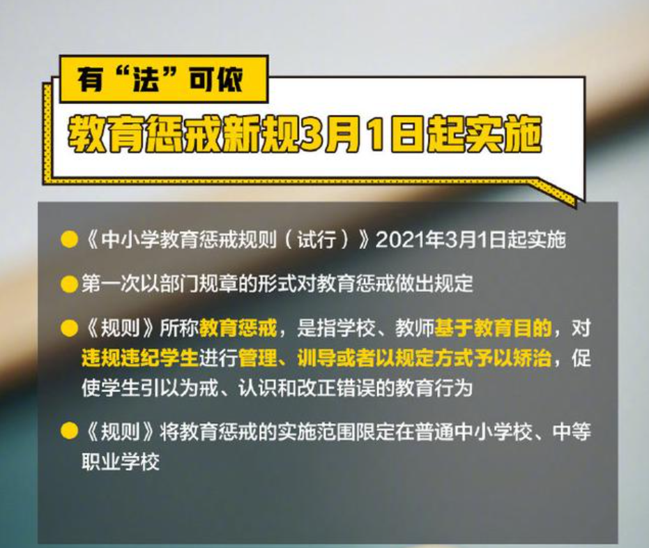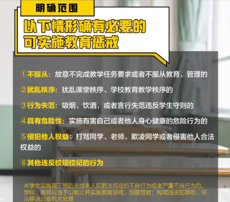 3月1日教育惩戒新规正式实施了,在最新的规定当中,明确了哪些情况下老师可以实施惩戒教育。比如故意不完成教学任务,或者不服从管理,扰乱课堂秩序,吸烟饮酒违反学生守则,打骂老师同学,侵害他人合法权益等等。