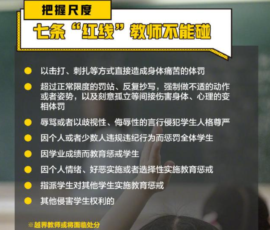 最新的规定从多方面保护了老师与孩子的利益。老师看后拍手称快,以后在班级里终于可以抬头做人了,能够好好管教一下那些不听话的孩子。家长则认为早就应该实施这样的规定了,只要不让老师做一些过分的体罚动作,适当的惩戒自己的孩子,他们是能够接受的。