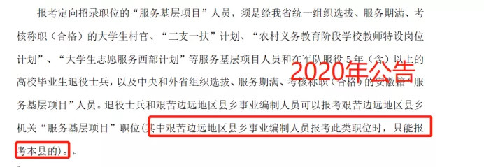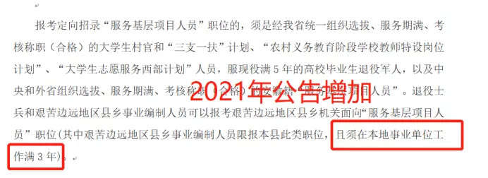 2021年增加了“报考艰苦边远地区县乡事业编制人员须在本地事业单位工作满3年的”的规定,偏向招录本地长期居住工作人员,有助于解决本地就业和维护社会稳定。