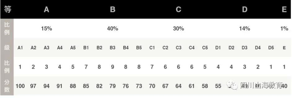 河北、辽宁、江苏、福建、湖北、湖南、广东、重庆8省市制定的等级赋分方案五等级一分一档制度,是将考生的卷面成绩的原始分划分为A、B、C、D、E五个等级,各等级所占比例约为15%,35%,34%,15%,1%,最低赋分为30分,最高100分。也就是说,考生即使交白卷,按照名次也有30分的成绩。