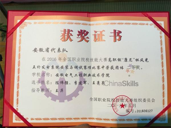5月27日至5月29日,2016年全国职业院校技能大赛“风光互补发电系统安装与调试”赛项在南京工业职业技术学院体育馆举行。本次大赛共有来自全国22个省、直辖市、自治区的51支代表队共153人参加激烈角逐。来自我院的李建军、陈伟强、王亮亮三位同学在指导老师王萍的指导下,经过四个多月的刻苦训练,凭借扎实的基本功和顽强的毅力,击败了众多实力强劲的对手,最终获得全国二等奖(排名第六名)的优异成绩。