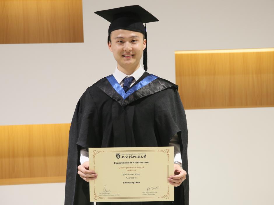 西交利物浦大学建筑系首次颁发“BDP-法雷尔”奖,大四学生孙晨星(音)成为首位获奖者得此殊荣。